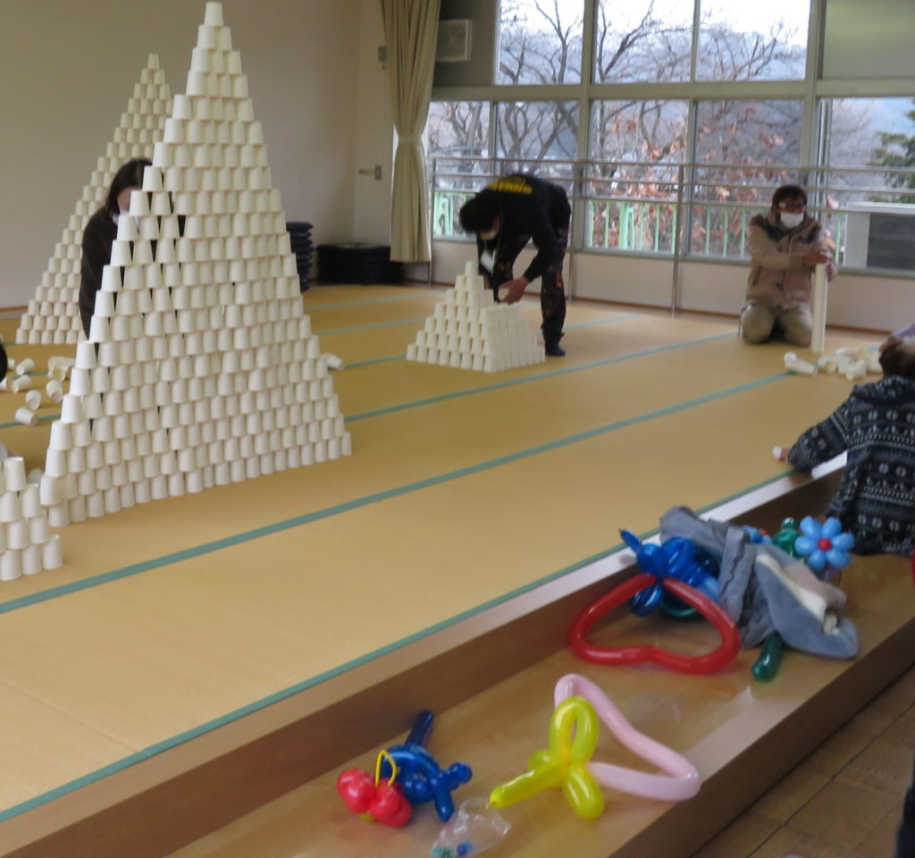 今回は紙コップタワーを行いました。紙コップタワーは好きな形に積み上げて最後はくずす遊びです。