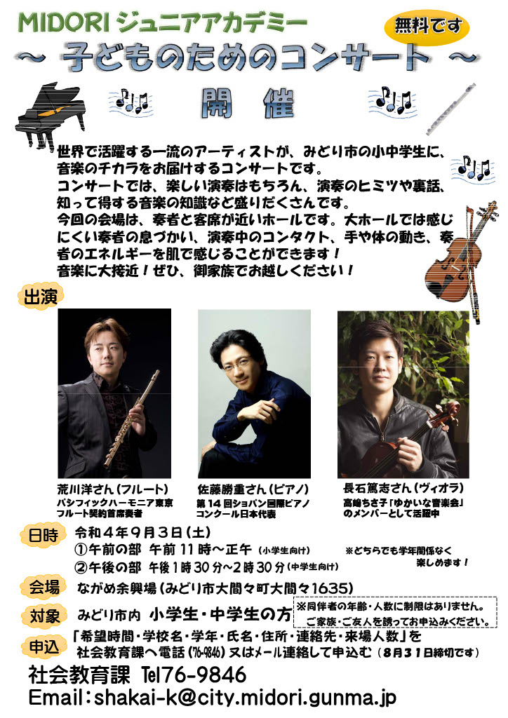 9月3日(土)に「子どものためのコンサート」がながめ余興場で行われます。ピアノは見たり聞いたりすることも多いですが今回はピアノの他にフルートとヴィオラをまじかに見ながら演奏を楽しむことができます。この機会に是非音楽を楽しんでください。